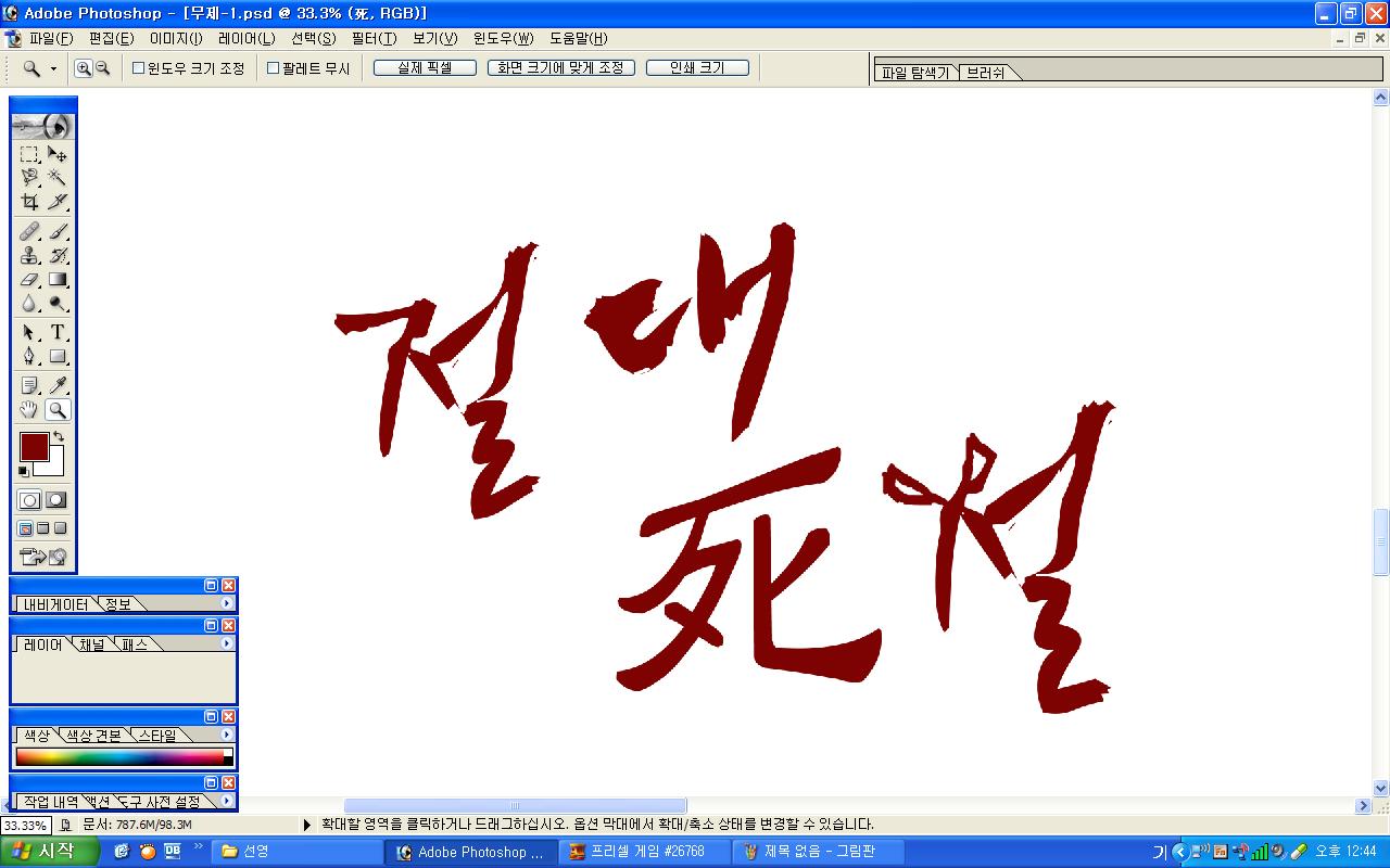 정중히 캘리 부탁드립니다. -_- 류재철 일반 0 5673 2009.11.16 11:18 실력자 분들이 많이 계셔서 이렇게 염치없게 부탁드립니다. - 절대死절 : 첨부한 파일 참고해주시면 감사하겠습니다.(약간 거친느낌? ^^;;) : '절'자의 ㅈ은 가위로...^^;; : 포스터 제작용이라 ai 파일이 필요합니다. 대학동아리 연극공연 포스터로 쓸 예정입니다. 비상업적인 공연이라 이렇게 부탁드립니다.